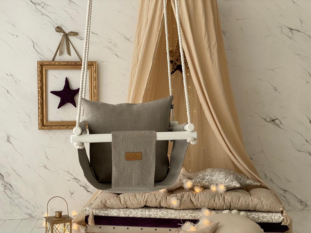 Naturell barngunga eller sittgunga för barn och baby. Tyggungan är tillverkad av lin som gör att tyget andas bra och vilket dessutom ger en naturnära känsla. Barngungans rep är i oblekt bomull. En ekologisk barngunga som lyfter barnrummet och sprider mycket glädje till barnen. Dessutom fungerar gungan som en utmärkt avlastning till föräldrarna. Naturell barngunga Idun är 100% hantverk och handgjord med värme och kärlek.